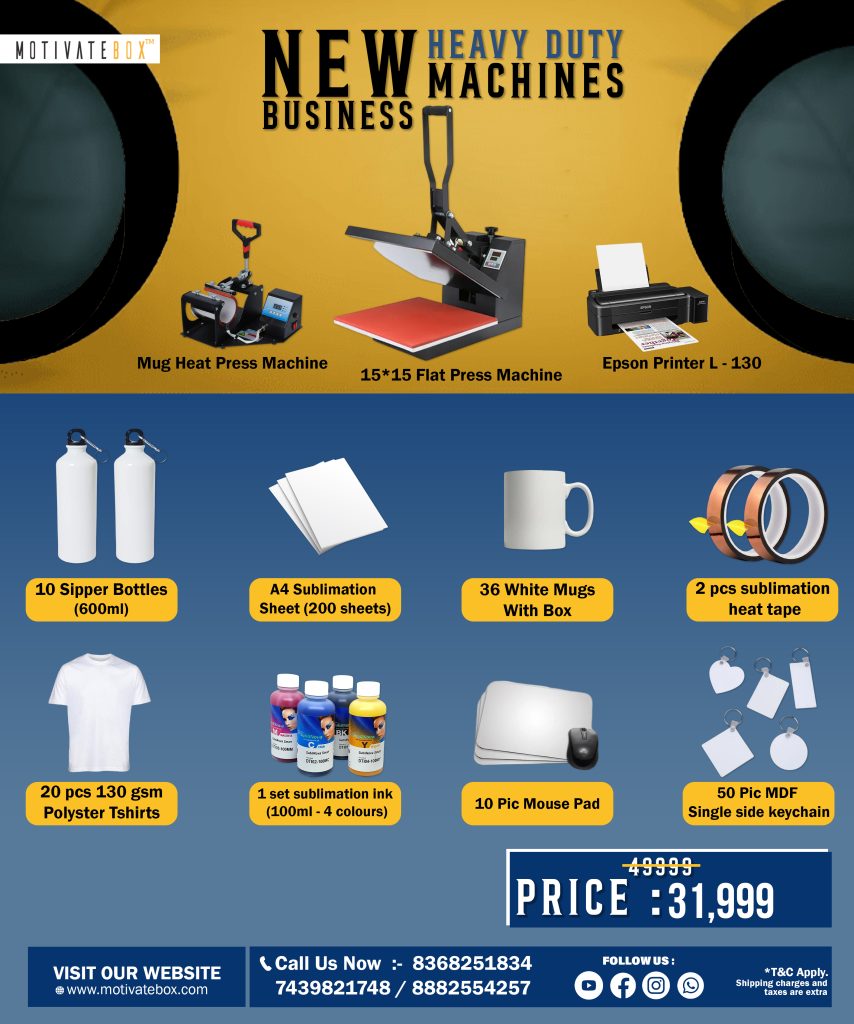 Kickstart a powerful and profitable sublimation printing business with Motivate Box’s “New Business – Heavy Duty Machine Combo.” This premium bundle is designed for entrepreneurs who want reliability, performance, and long-term durability from day one. With a 15×15 Heavy Duty Flat Press Machine and a dedicated Mug Press Machine, you get the strength needed to handle bulk orders with consistent, professional-quality results.