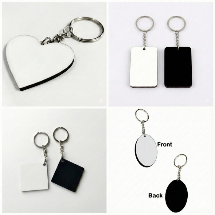 Single-sided MDF sublimation keychain blanks available in Heart and Rectangle shapes. Lightweight and sublimation-ready, these keychains are ideal for personalized gifting, promotions, and bulk customization.